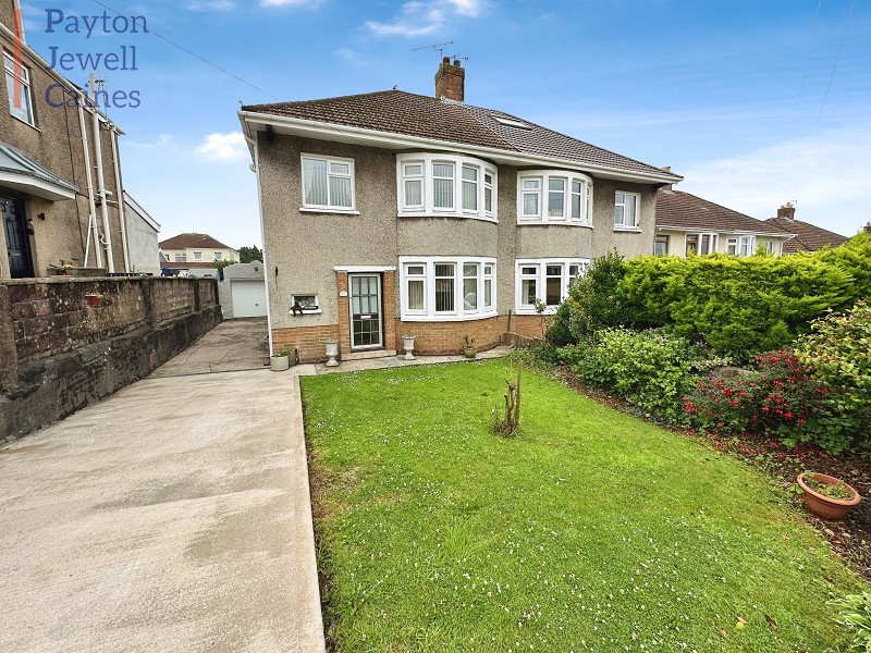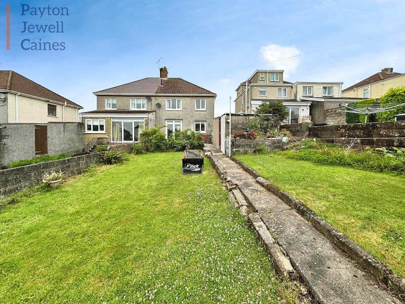 Enclosed rear garden laid to patio, two sections of lawn with a central pathway and traditional washing line. Door into rear storage behind the garage.