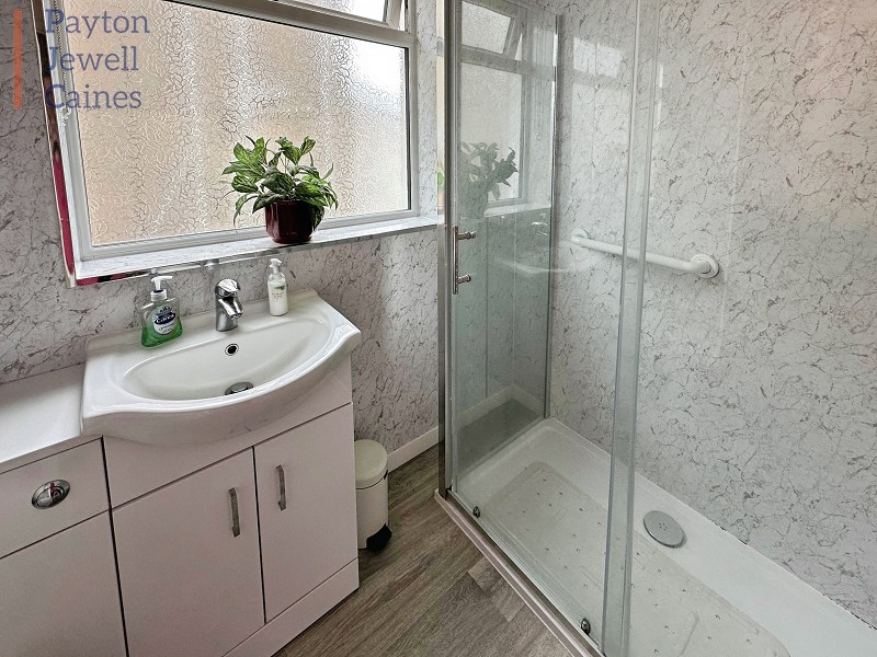 PVCu frosted glazed window to the side with a fitted roller blind and finished with respatex ceiling and walls, wall mounted heated chrome towel rail and wood effect vinyl flooring. Three piece suite comprising vanity WC vanity sink unit with chrome mixer tap and large walk in shower with sliding glazed door housing a plumbed shower with rainwater head and grab rail.