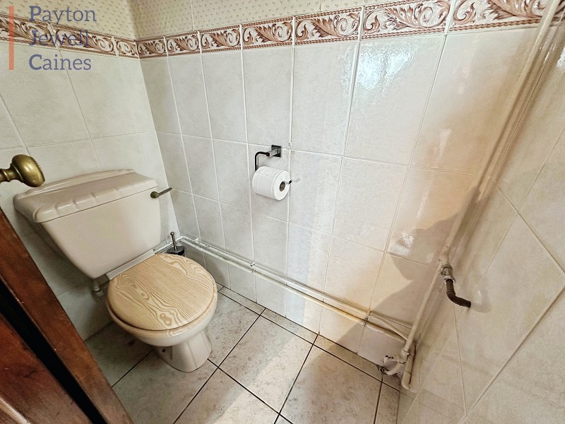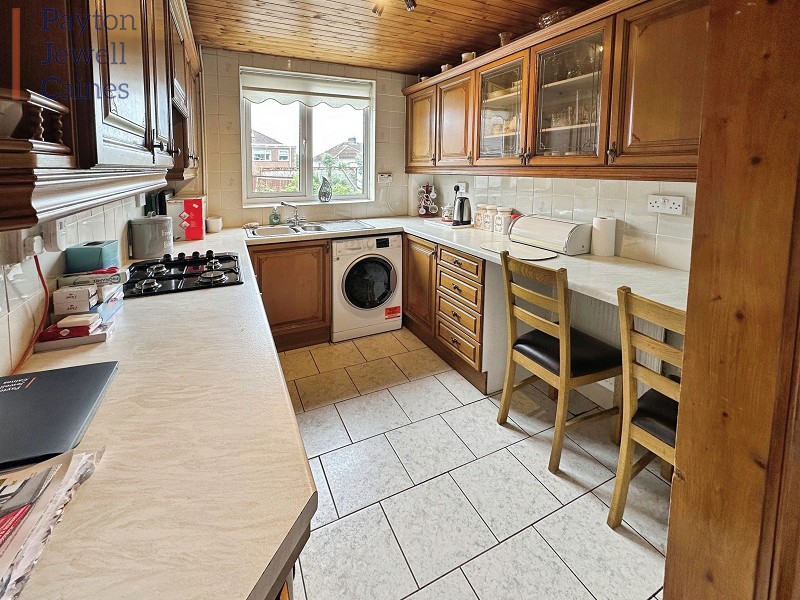 Benefiting from dual aspect natural light via PVCu double glazed window overlooking the rear garden with a fitted roller blind and a PVCu frosted glazed door leading out to the side driveway. The kitchen is finished with a wooden tongue and groove ceiling, central spot lights, full height ceramic tiles to the wall and tiled flooring. A range of low level and wall mounted kitchen units with a complementary roll top work surface. Inset one and a half basin sink with mixer tap and drainer. Integrated electric oven with four ring gas hob and overhead extractor hood. Space for under counter fridge. Plumbing for automatic washing machine. Glazed display cabinets. Breakfast bar. Door through to downstairs WC.