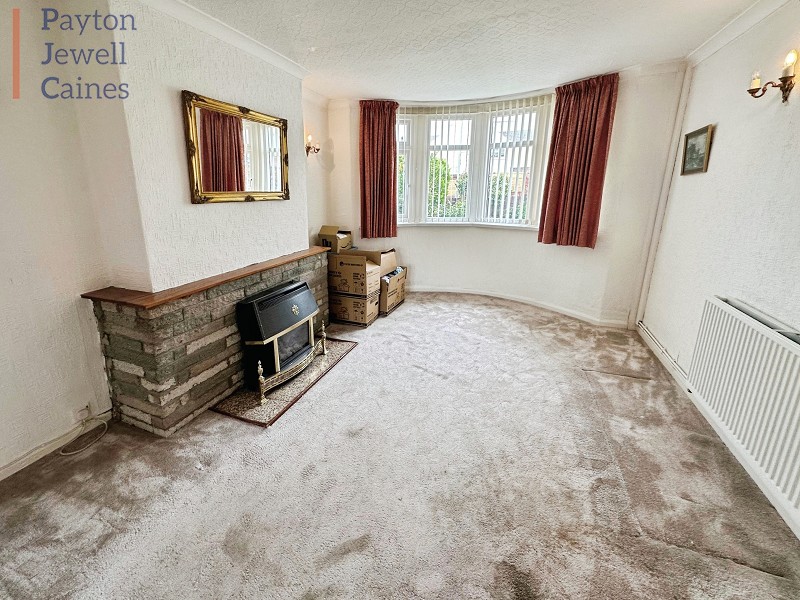 Measurements into the bay. Overlooking the front via PVCu double glazed bay window with fitted vertical blinds and finished with papered and coved ceiling, papered walls, high level feature shelving above the arch way, wall lights to remain, wall mounted gas fire with stone surround and wooden mantel, skirting and fitted carpet.