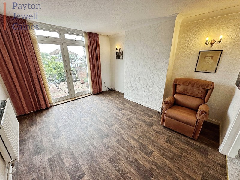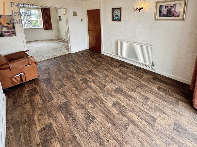 Overlooking the rear garden via PVCu double glazed French doors and finished with papered and coved ceiling, papered walls, skirting and wood effect vinyl flooring. Arch way through to reception 1/lounge.
