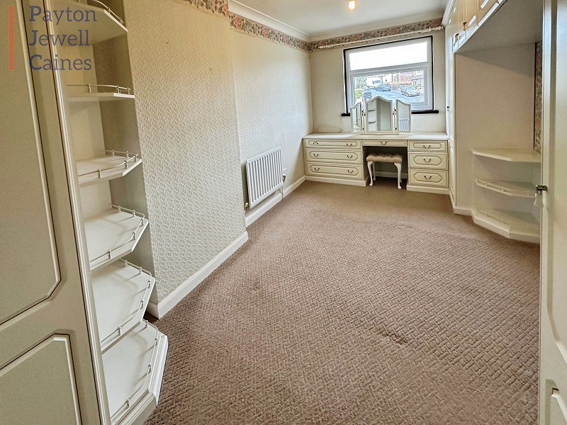 Overlooking the front via PVCu double glazed window and finished with a coved ceiling, papered and emulsioned walls with a high level feature border, skirting and fitted carpet. Fitted storage comprising two double fitted wardrobes plus one single, bedside cabinets over bed cupboard space, dressing table and shelving.