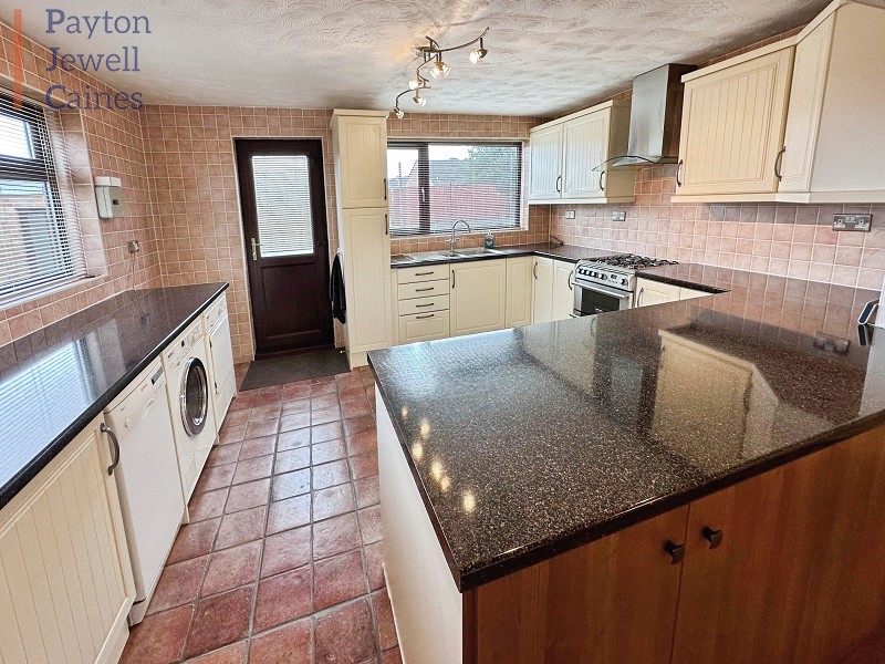 Overlooking the side of the property via PVCu double glazed window with a fitted vertical blind and finished with coved ceiling, two matching ceiling lights, papered and emulsioned walls, skirting and a continuation of the wood effect LVT flooring. Under stair storage cupboard. Additional storage cupboard with shelving and radiator. Open arch way and peninsular worktop through to the kitchen area.