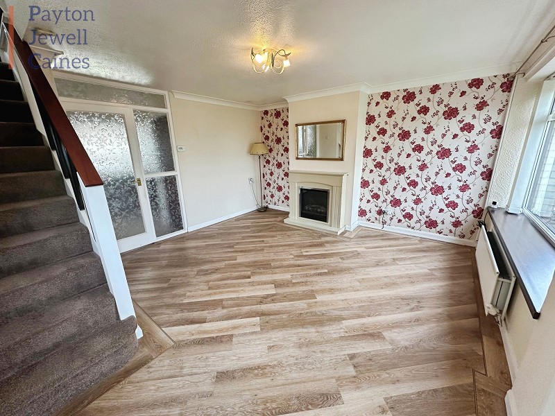 Benefiting from dual aspect natural light via PVCu double glazed window to the side and to the front with fitted vertical blind and finished with a coved ceiling, central light fitting, papered and emulsioned walls with one feature papered wall, skirting and LVT wood effect flooring. Wall mounted feature fireplace. Stairs to the first floor. Glazed door leading through into the open plan kitchen/diner.