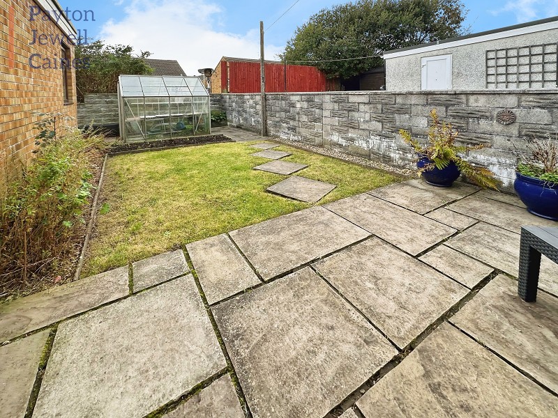 Enclosed rear garden laid to patio and lawn with raised beds. Additional rear patio with greenhouse and an additional space behind the garage.