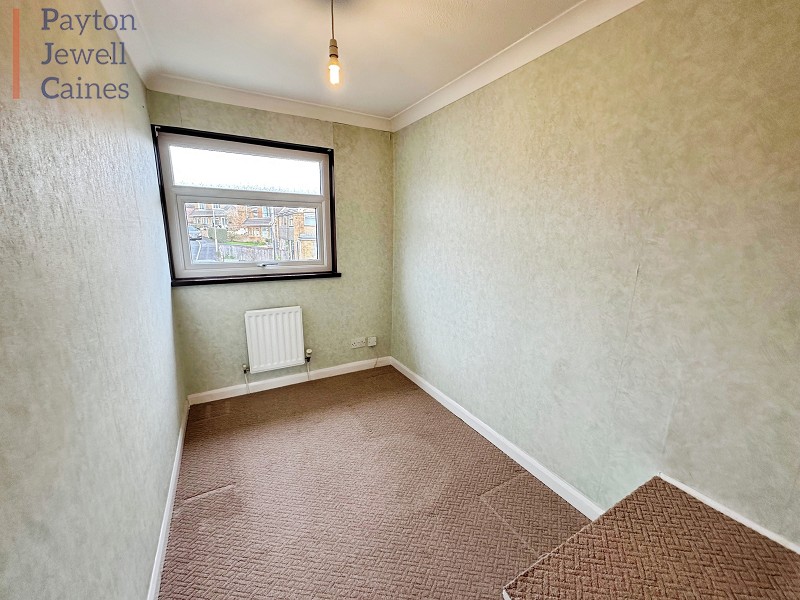 Overlooking the front via PVCu double glazed window and finished with a coved ceiling, papered walls, skirting and fitted carpet. Fitted storage cupboard with shelving above the stairs.