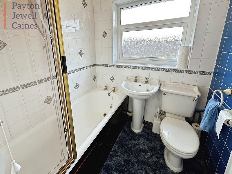 PVCu frosted glazed window to the rear, central light fitting, coved ceiling, full height ceramic tiled walls, radiator and fitted carpet. Three piece suite in white comprising WC, wash hand basin and bath with over bath plumbed shower.